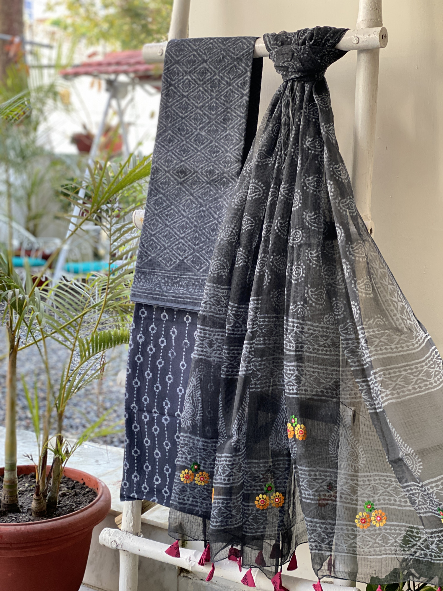 GREY-BLACK "DABU" HAND BLOCK PRINT KOTA SHIRT AND A BLACK HAND BLOCK PRINTED COTTON BOTTOM PAIRED WITH A GREY-BLACK KOTA HAND BLOCK PRINT DUPATTA WITH MANUAL MACHINE EMBROIDERY, ACCESSORISED WITH TASSLES.