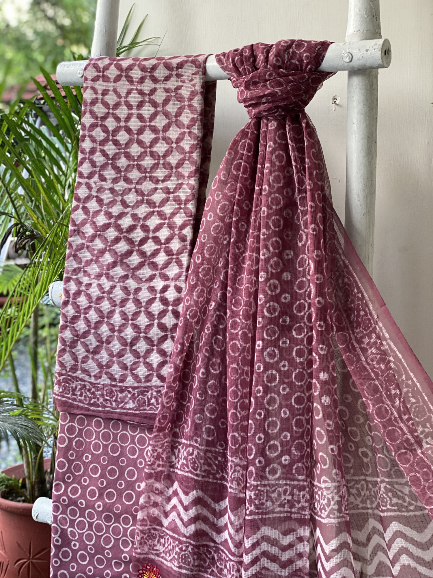 RUBY "DABU" HAND BLOCK PRINT KOTA SHIRT AND A RUBY HAND BLOCK PRINTED COTTON BOTTOM PAIRED WITH A RUBY KOTA HAND BLOCK PRINT DUPATTA WITH MANUAL MACHINE EMBROIDERY, ACCESSORISED WITH TASSLES.