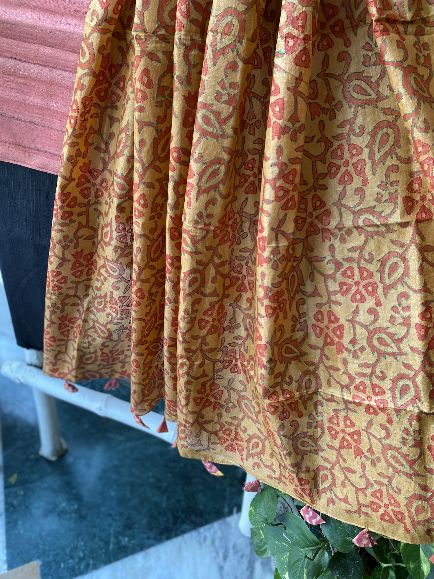RUST GICHA TUSSAR shirt AND BLACK COTTON TUSSAR BOTTOM paired with A MUSTARD KANTHA HAND EMBROIDERED SILK dupatta AND accessorised with tassles.