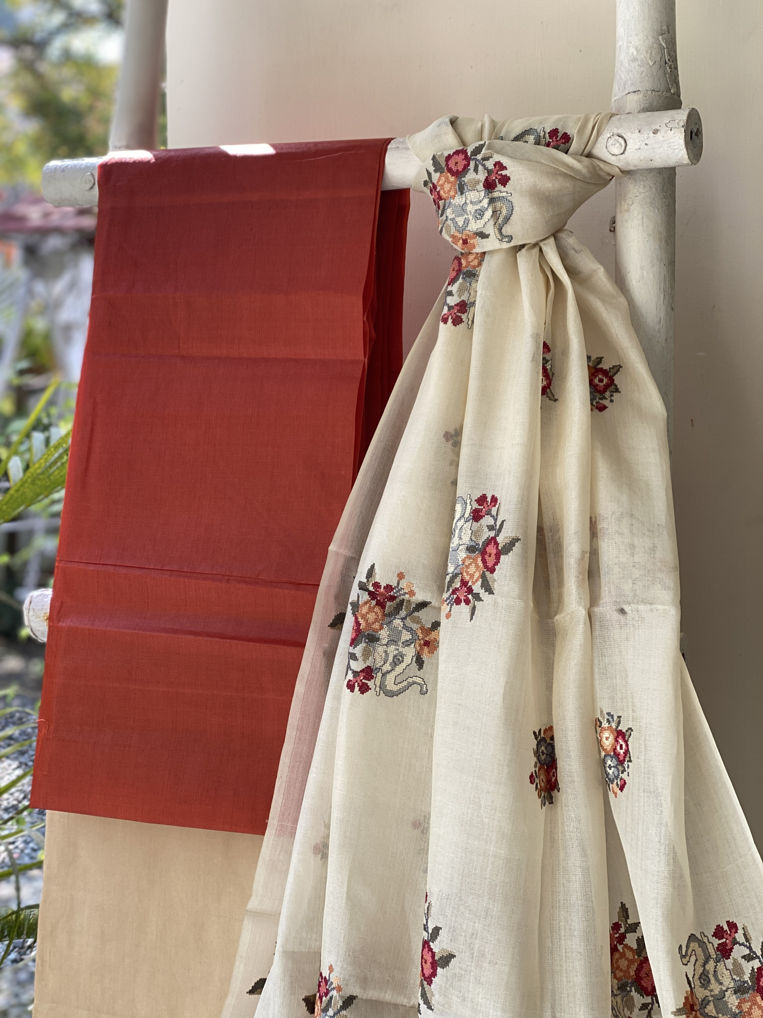 RUST TUSSAR SILK SHIRT AND BEIGE HANDLOOM SILK BOTTOM PAIRED WITH AN OFF WHITE TUSSAR SILK EMBROIDERED DUPATTA WITH GICHA BORDER. ACCESSORISED WITH TASSELS