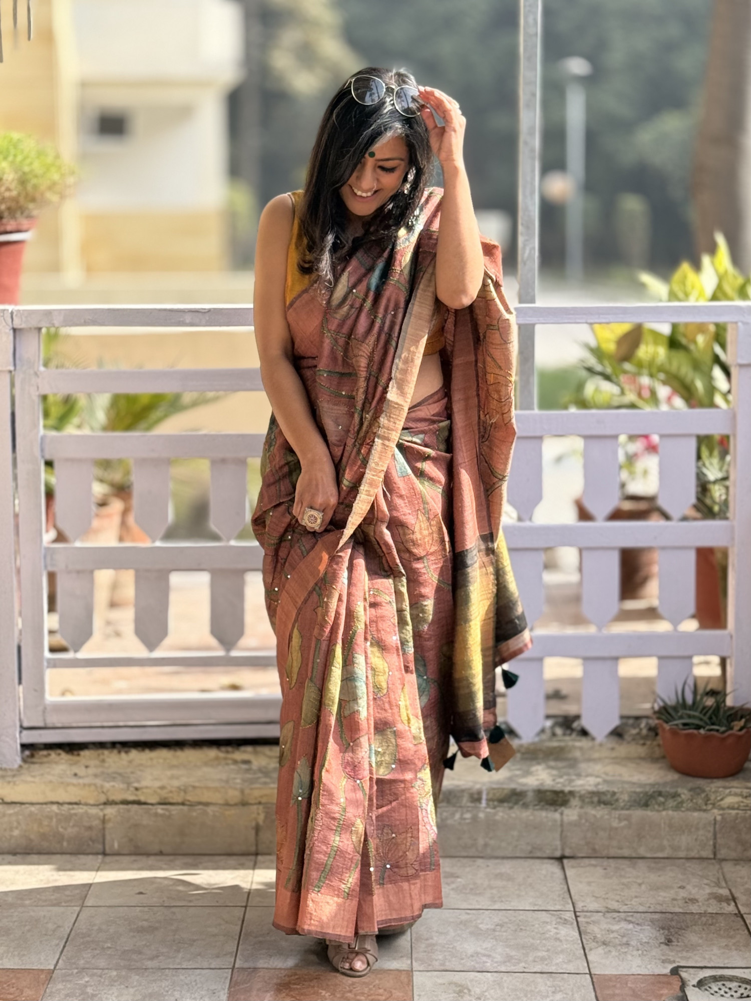 RUST PRINTED KANTHA EMBROIDERED GICHA TUSSAR SILK SARI