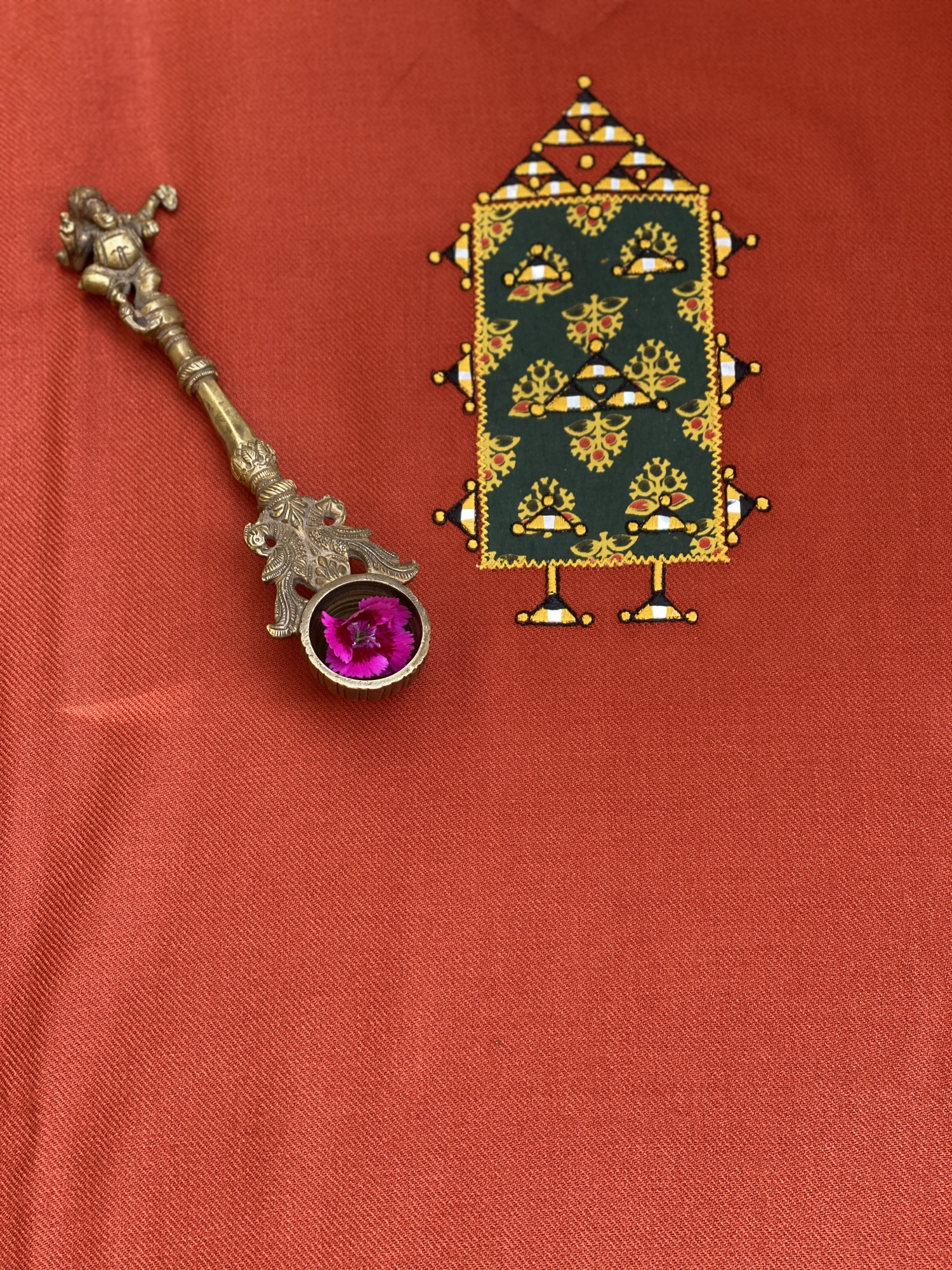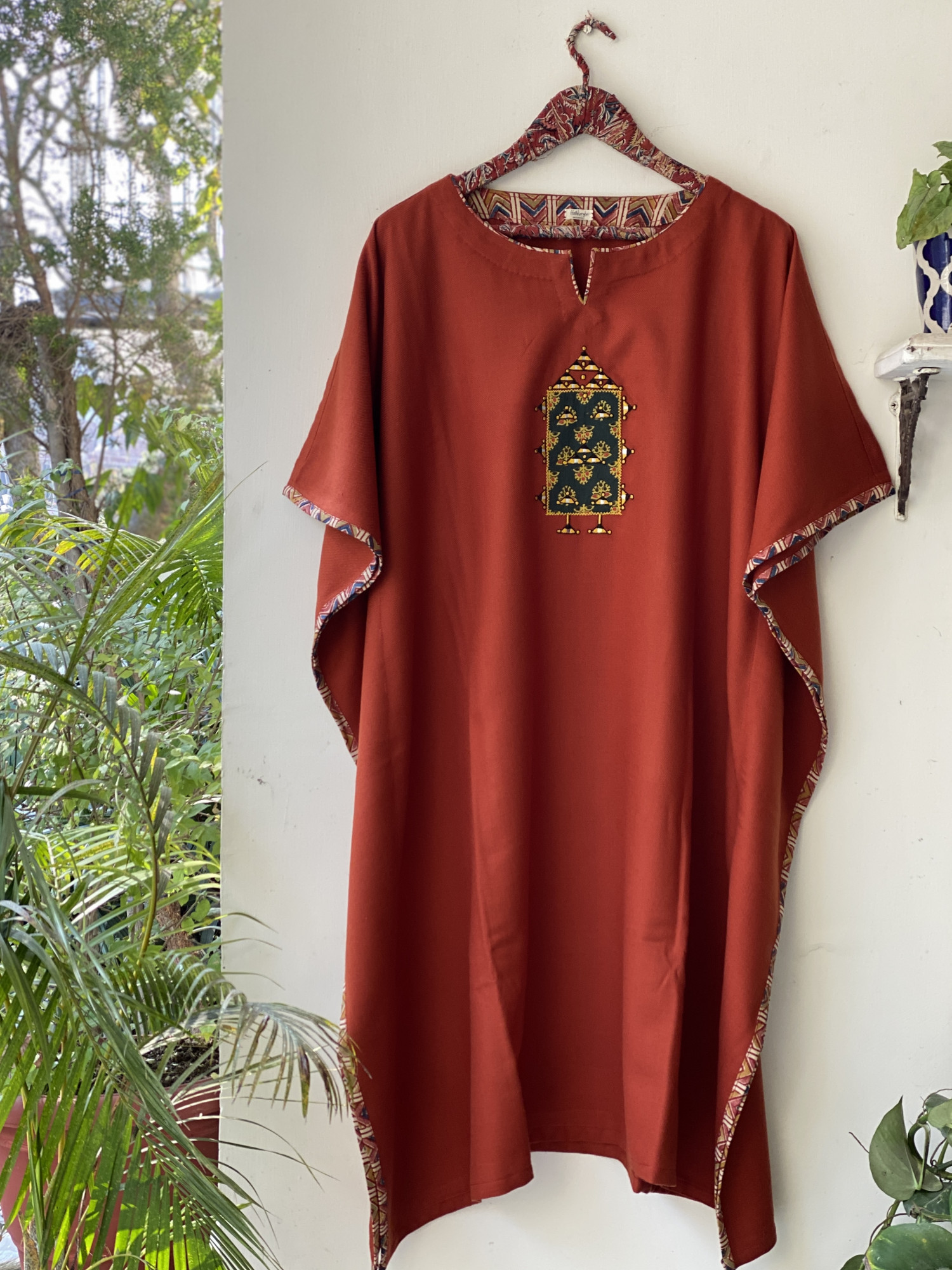 RUST WOOLLEN KAFTAN, WITH PATCHWORK AND MANUAL MACHINE EMBROIDERY.