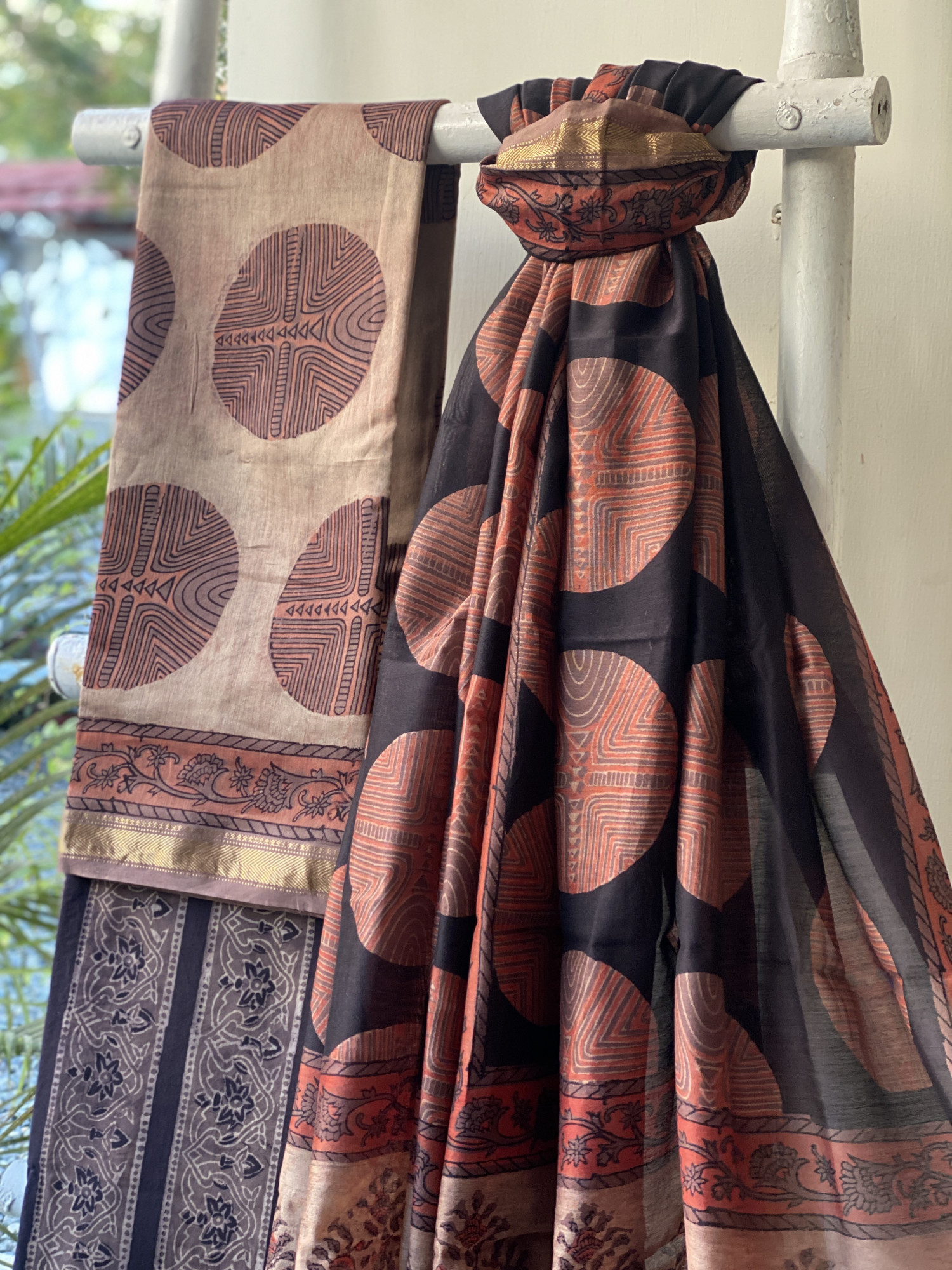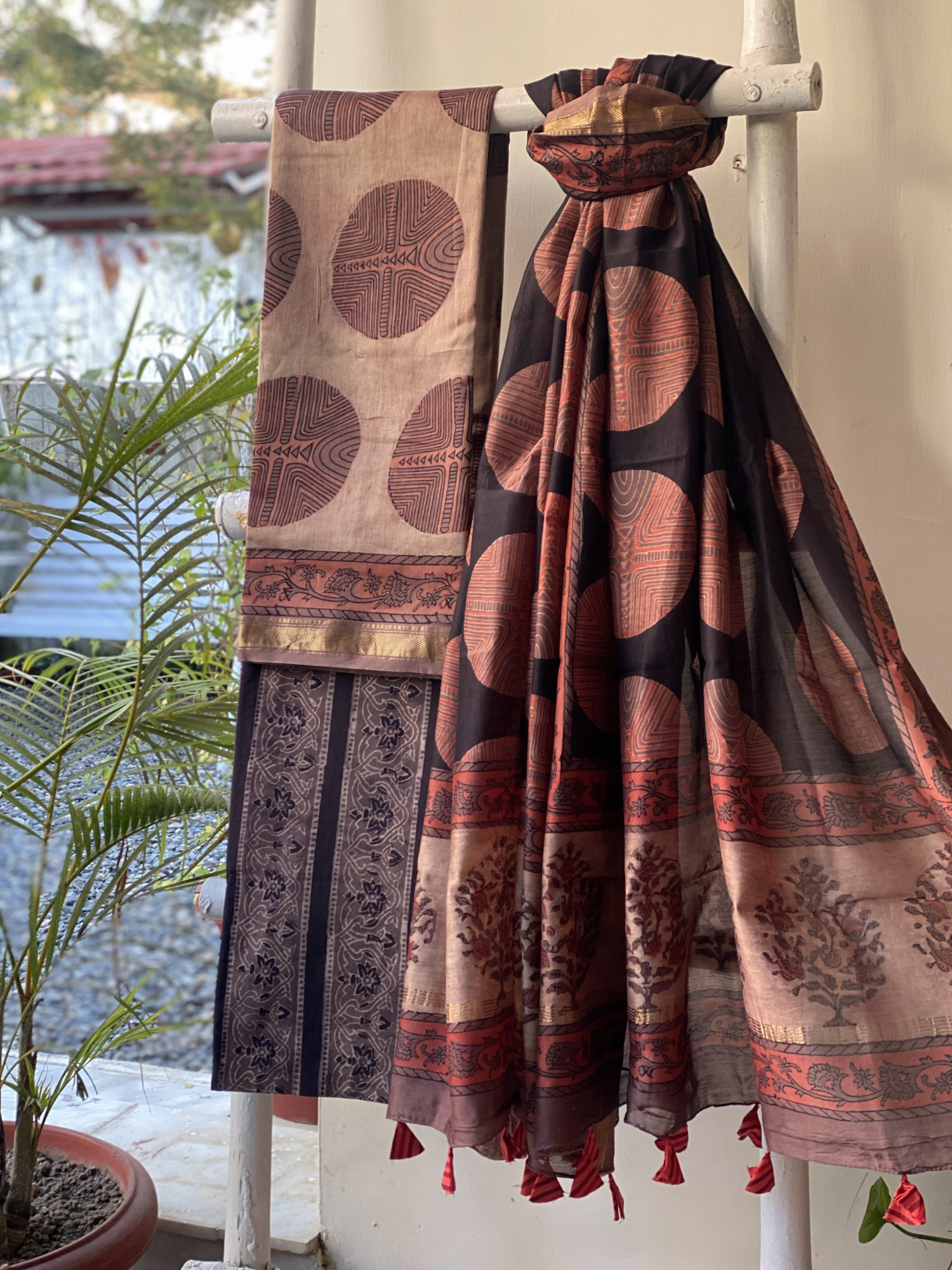 SALMON CHANDERI HAND BLOCK PRINTED SILK & COTTON ZARI WOVEN BORDER SHIRT WITH A BLACK HAND BLOCK PRINTED COTTON MULL BOTTOM PAIRED WITH A BLACK HAND BLOCK PRINT CHANDERI ZARI WOVEN BORDER DUPATTA, ACCESSORISED WITH TASSLES.
