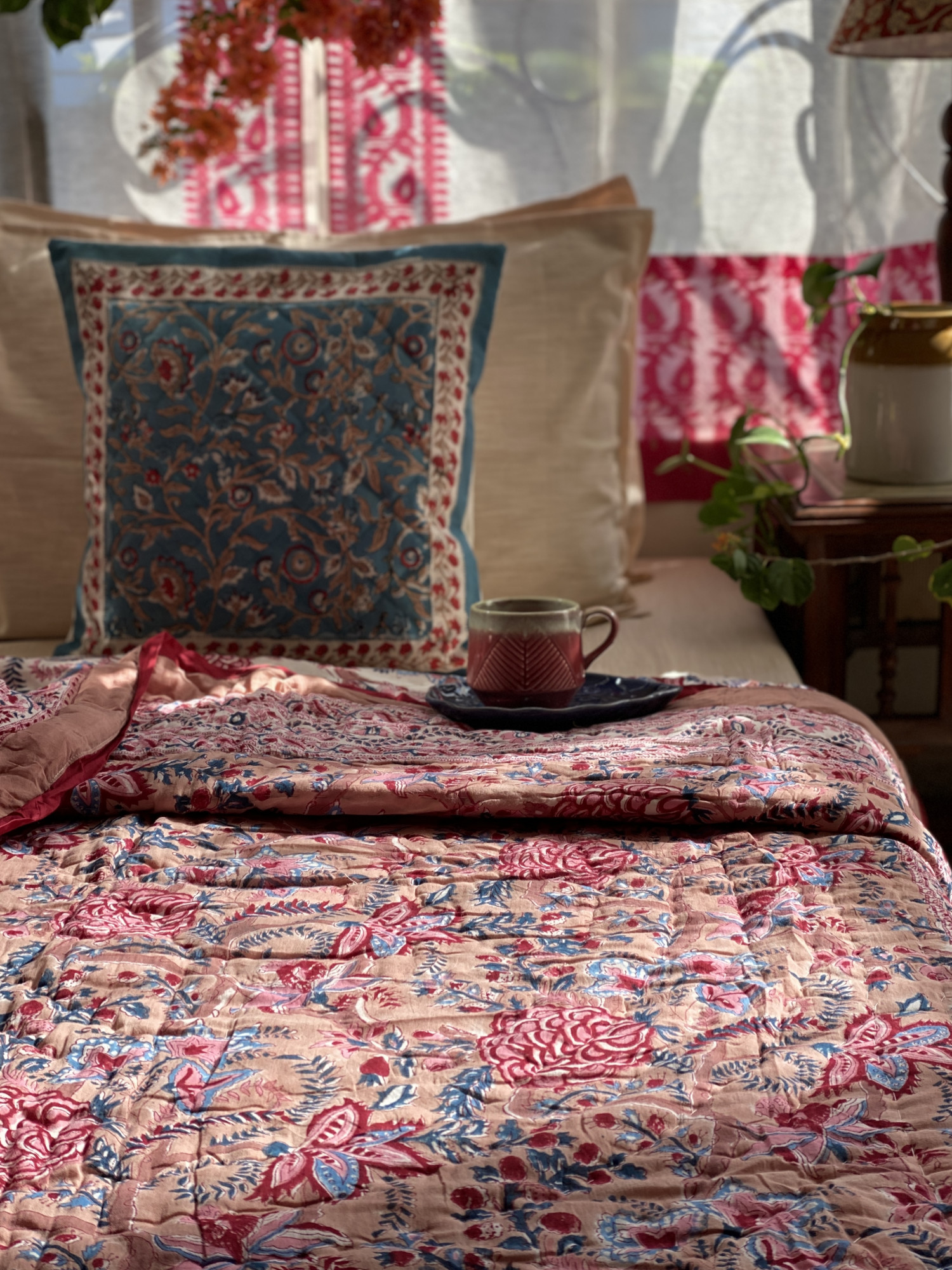 SALMON COTTON block print reversible (different block print design on each side) with cotton filling inside SINGLE SIZE JAIPURI RAZAI