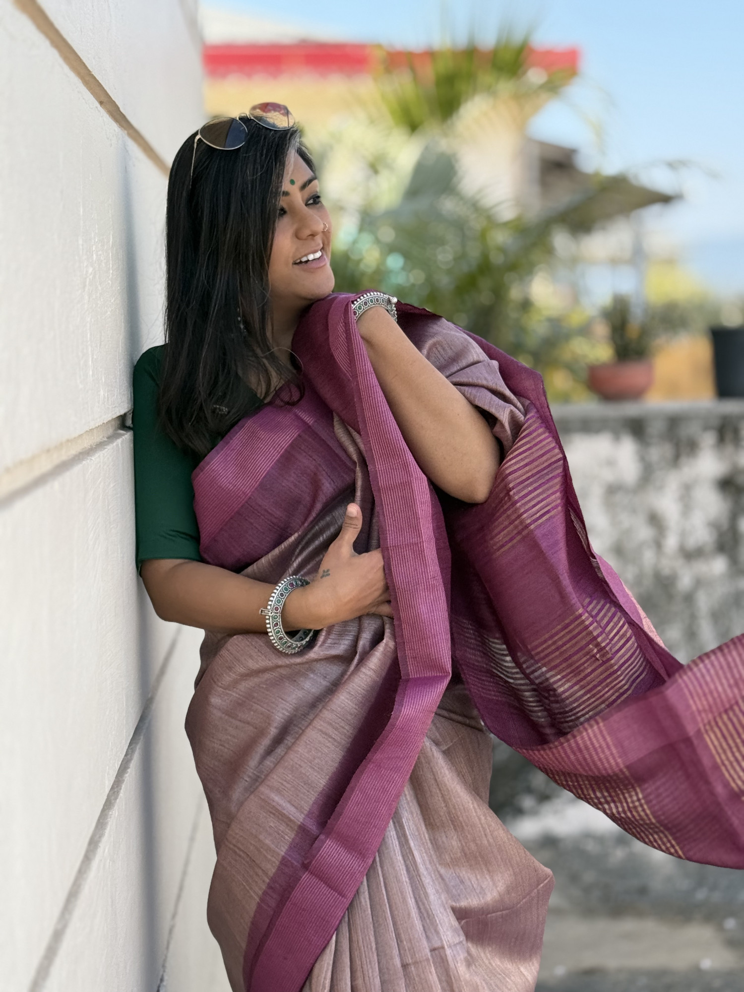 SALMON-WINE HAND WOVEN TUSSAR SILK SARI