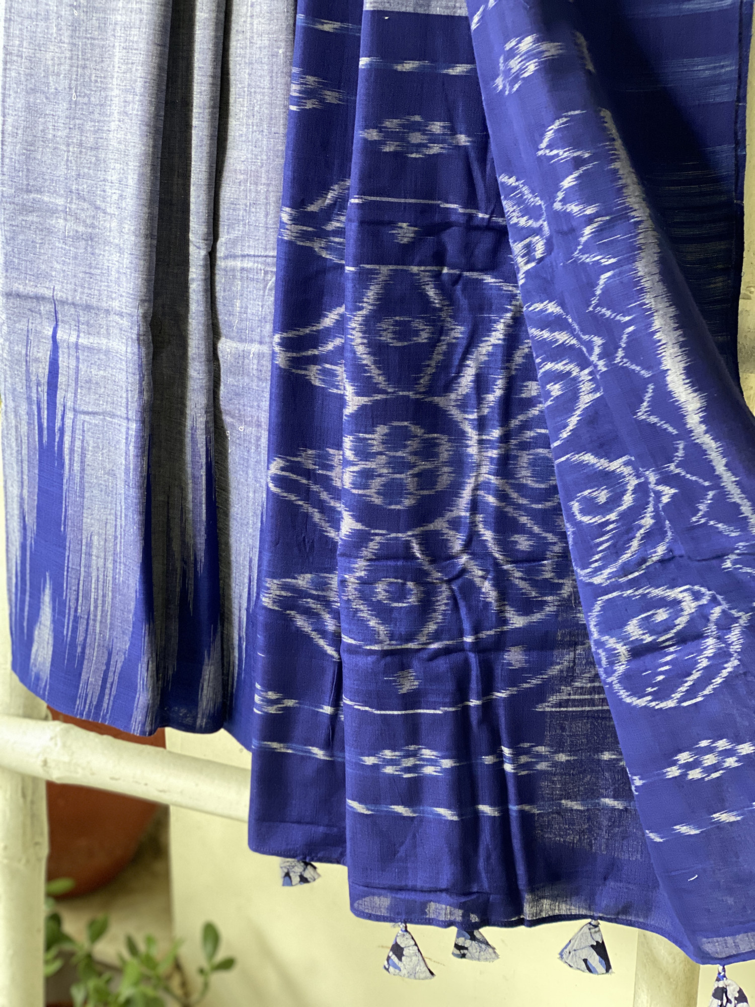 SHADED BLUE cotton 'KARGIL KUMBHA' IKKAT woven sari accessorized with tassels.