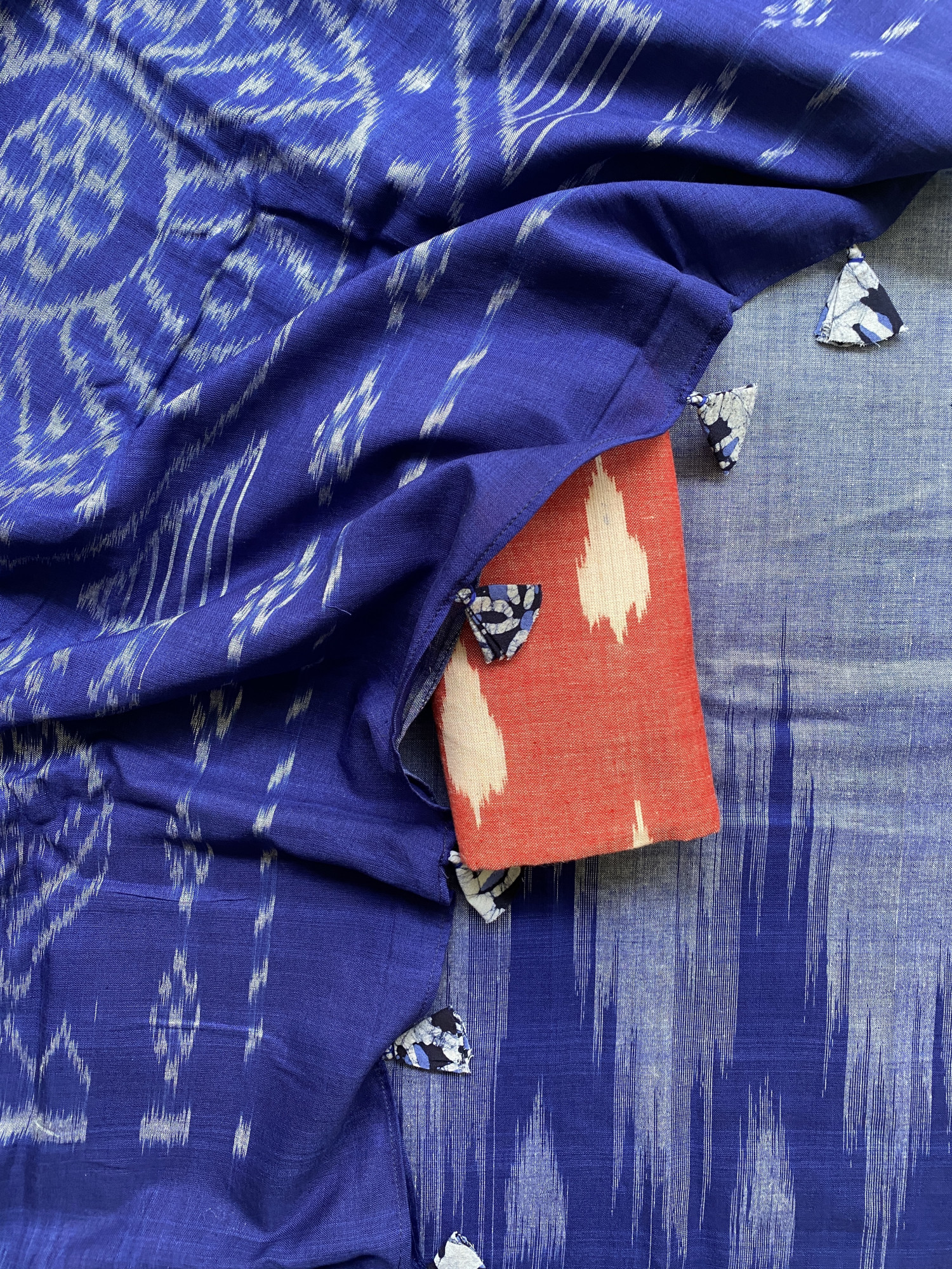 Does not include blouse piece of its own. Paired with a red ikkat woven cotton blouse ( 90 cms)
