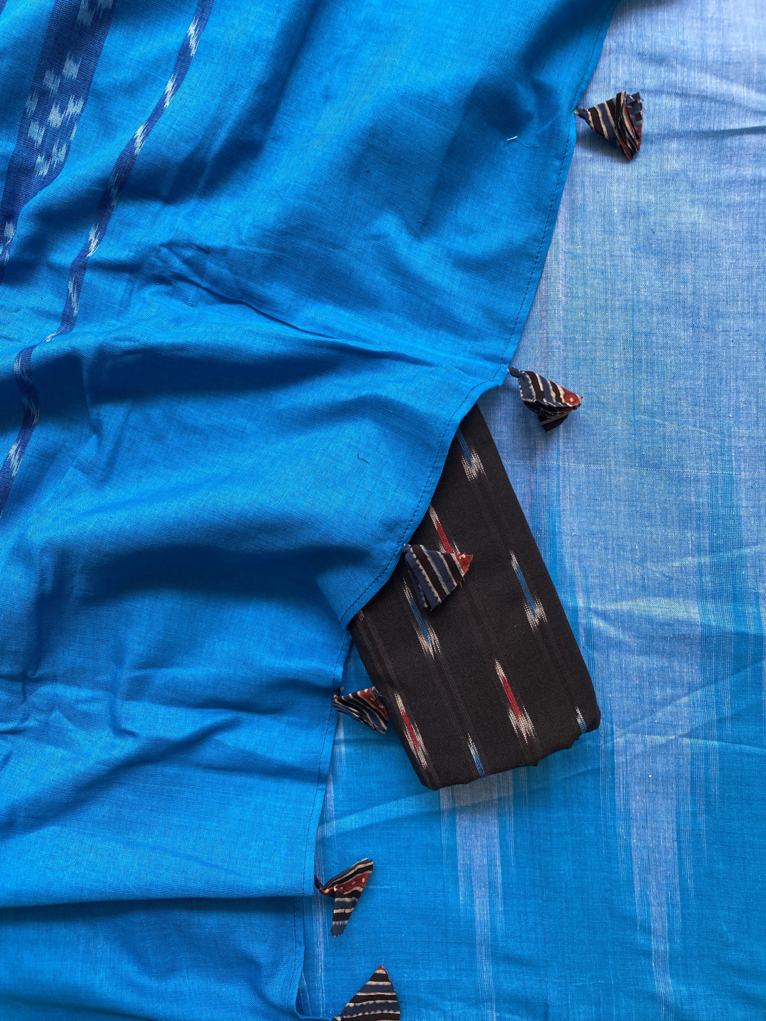 SHADED BLUE cotton 'KARGIL KUMBHA' IKKAT woven sari accessorized with tassels.