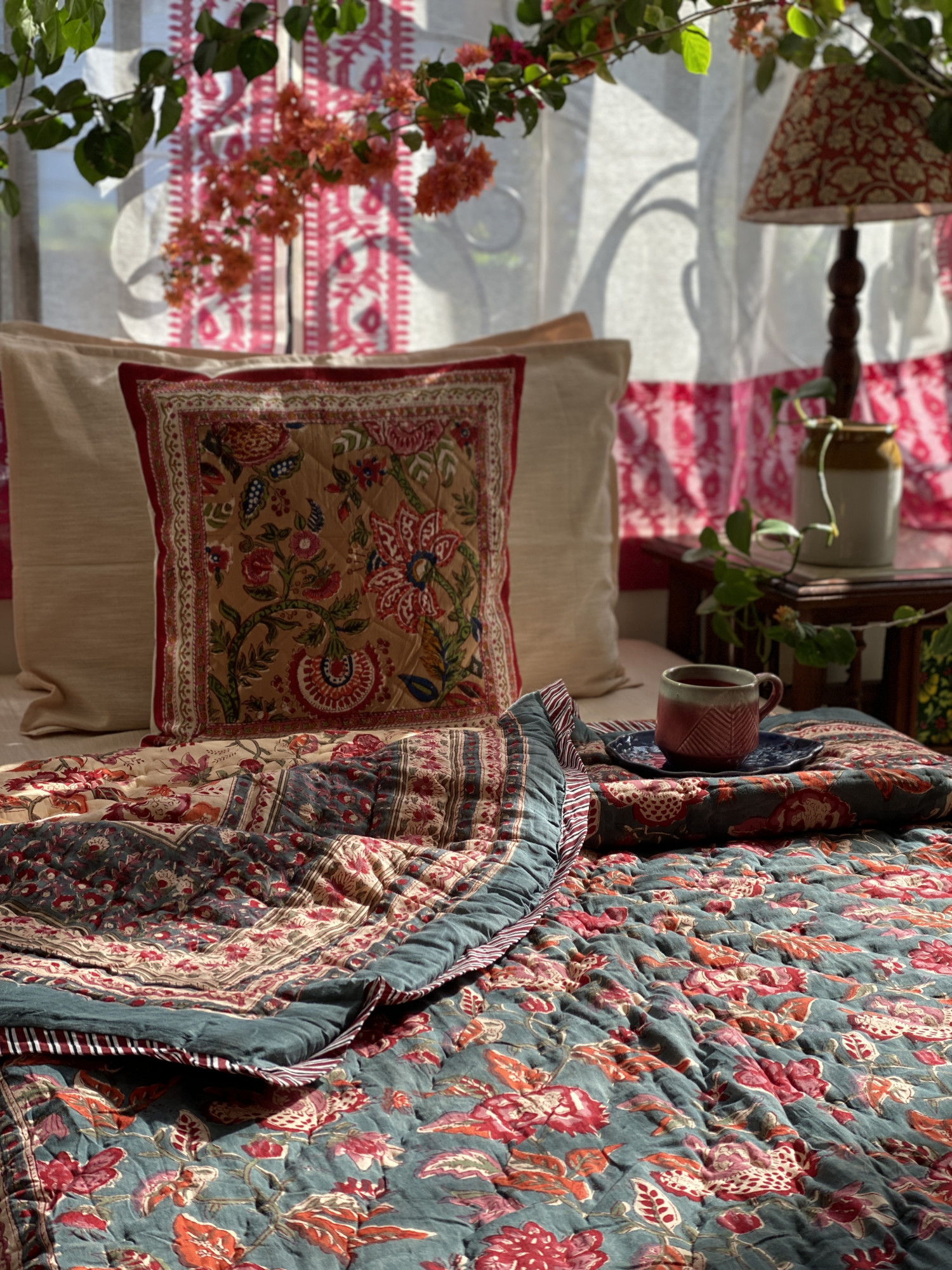 TEAL COTTON block print reversible (different block print design on each side)  with cotton filling inside SINGLE SIZE JAIPURI RAZAI