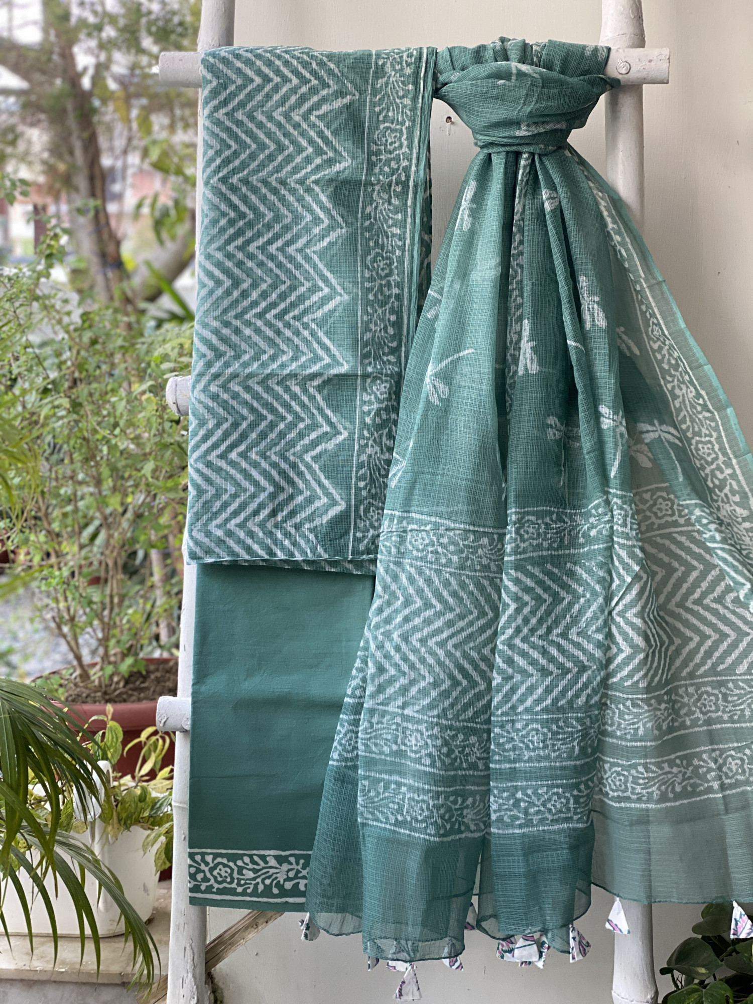 TEAL HAND BLOCK PRINT KOTA SHIRT (COMES WITH A MATCHING COTTON LINING PIECE) AND AN TEAL COTTON BLOCK PRINT BOTTOM PAIRED WITH AN TEAL KOTA BLOCK PRINT DUPATTA, ACCESSORISED WITH TASSLES.