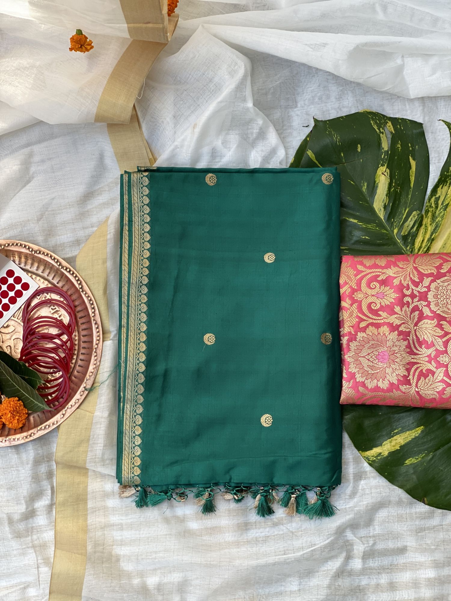 TEAL HAND WOVEN BANARASI KATAN SILK SARI WITH ZARI WOVEN BORDER AND PALLA AND ZARI BOOTAS ALL OVER, ACCESSORISED WITH TASSELS