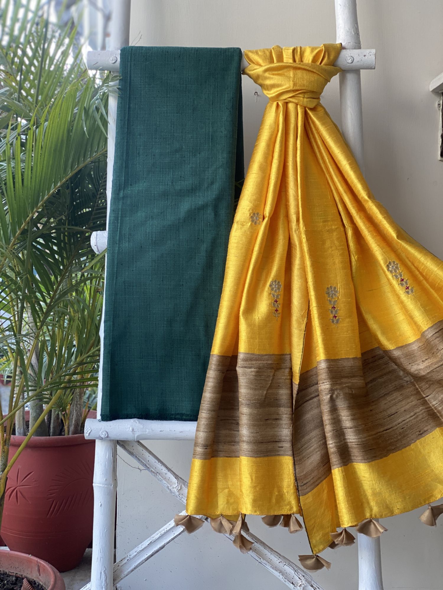TEAL COTTON TUSSAR SHIRT AND BOTTOM WITH YELLOW MATKA SILK DUPATTA WITH GICHA BORDER AND GOTA PATTI MANUAL MACHINE EMBROIDERY, ACCESSORISED WITH TASSELS.