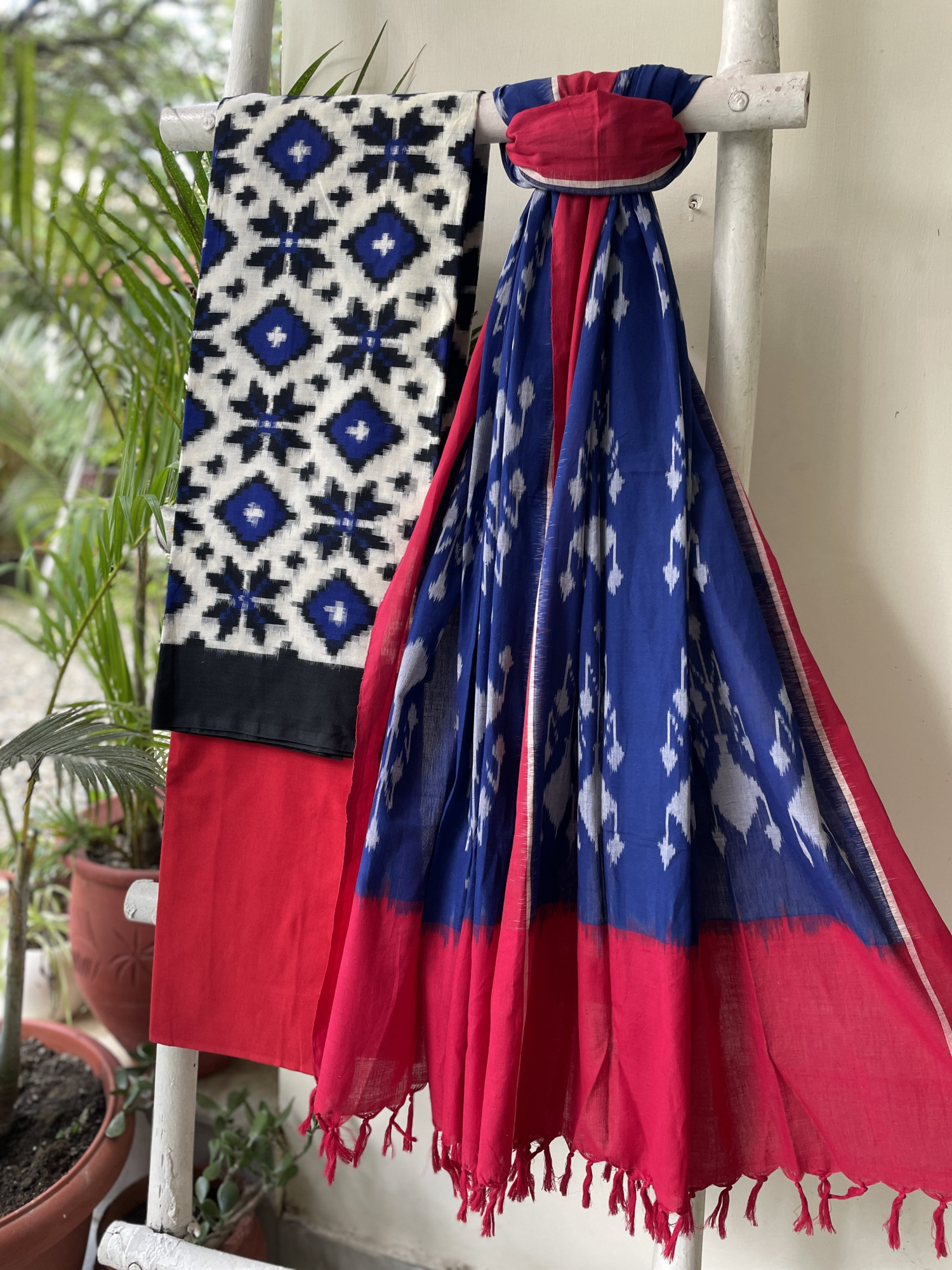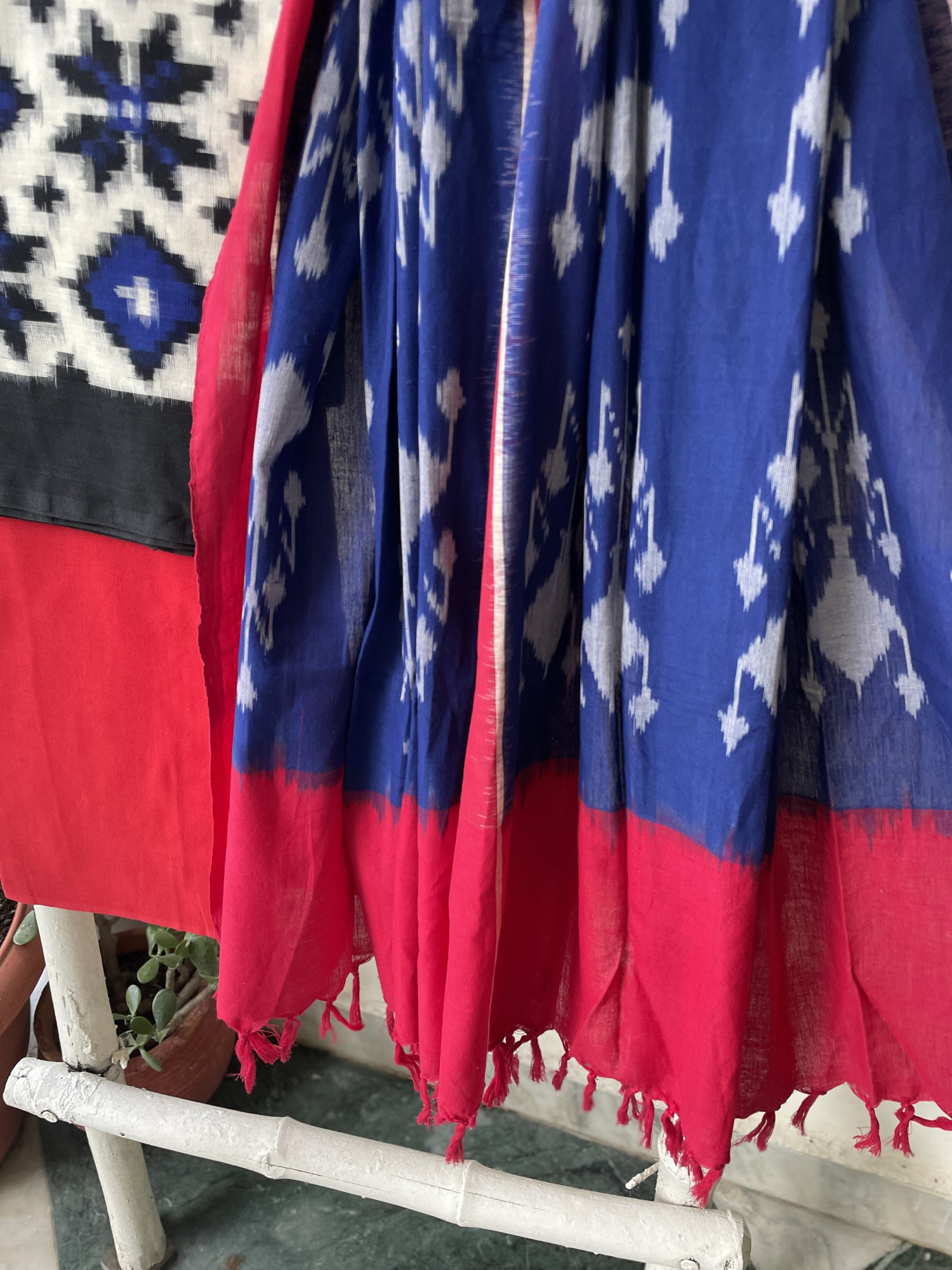 WHITE-MULTI COLOR IKKAT TELIA WOVEN COTTON SHIRT WITH RED COTTON BOTTOM paired with a BLUE & RED COTTON WOVEN IKKAT dupatta