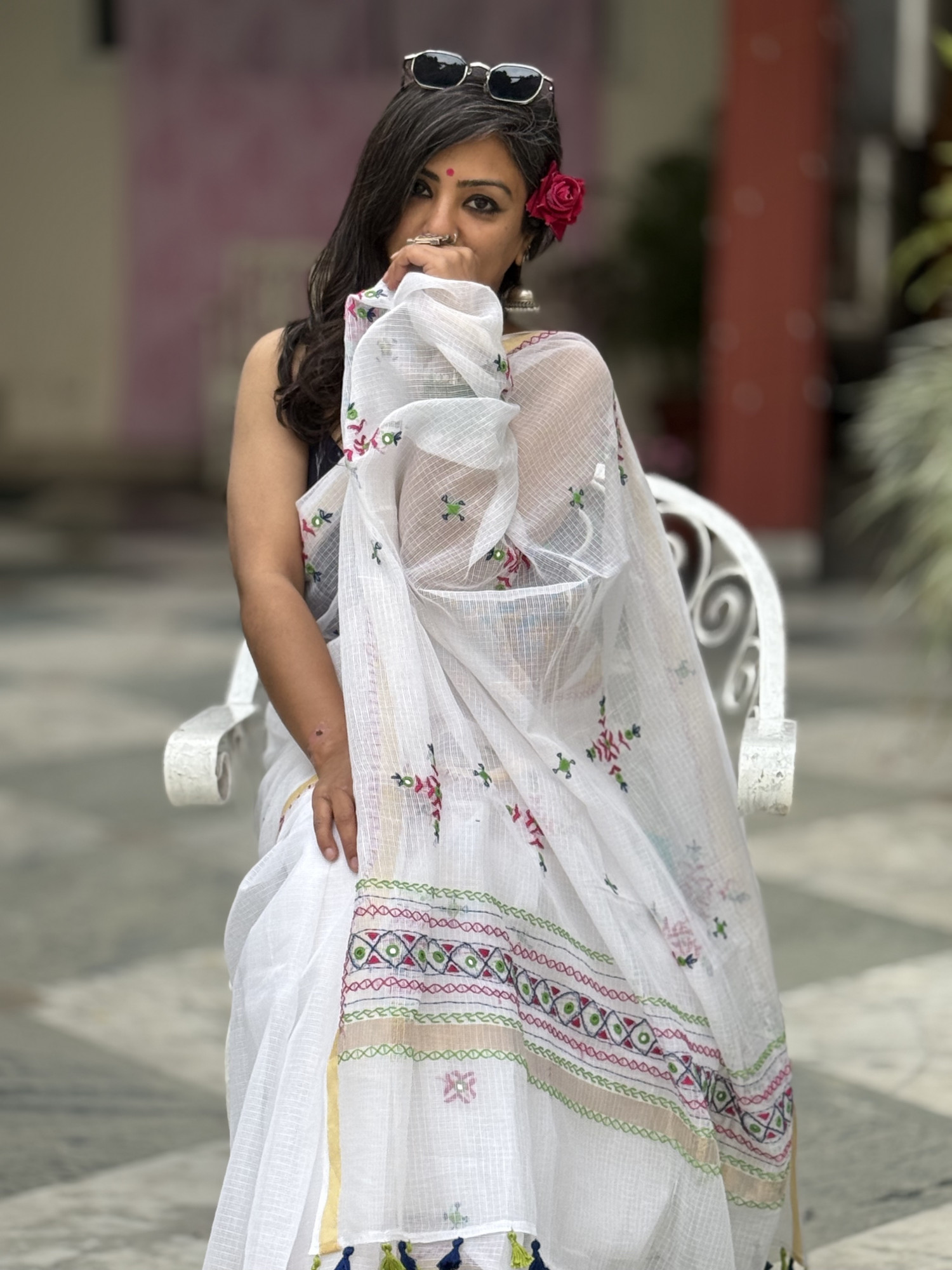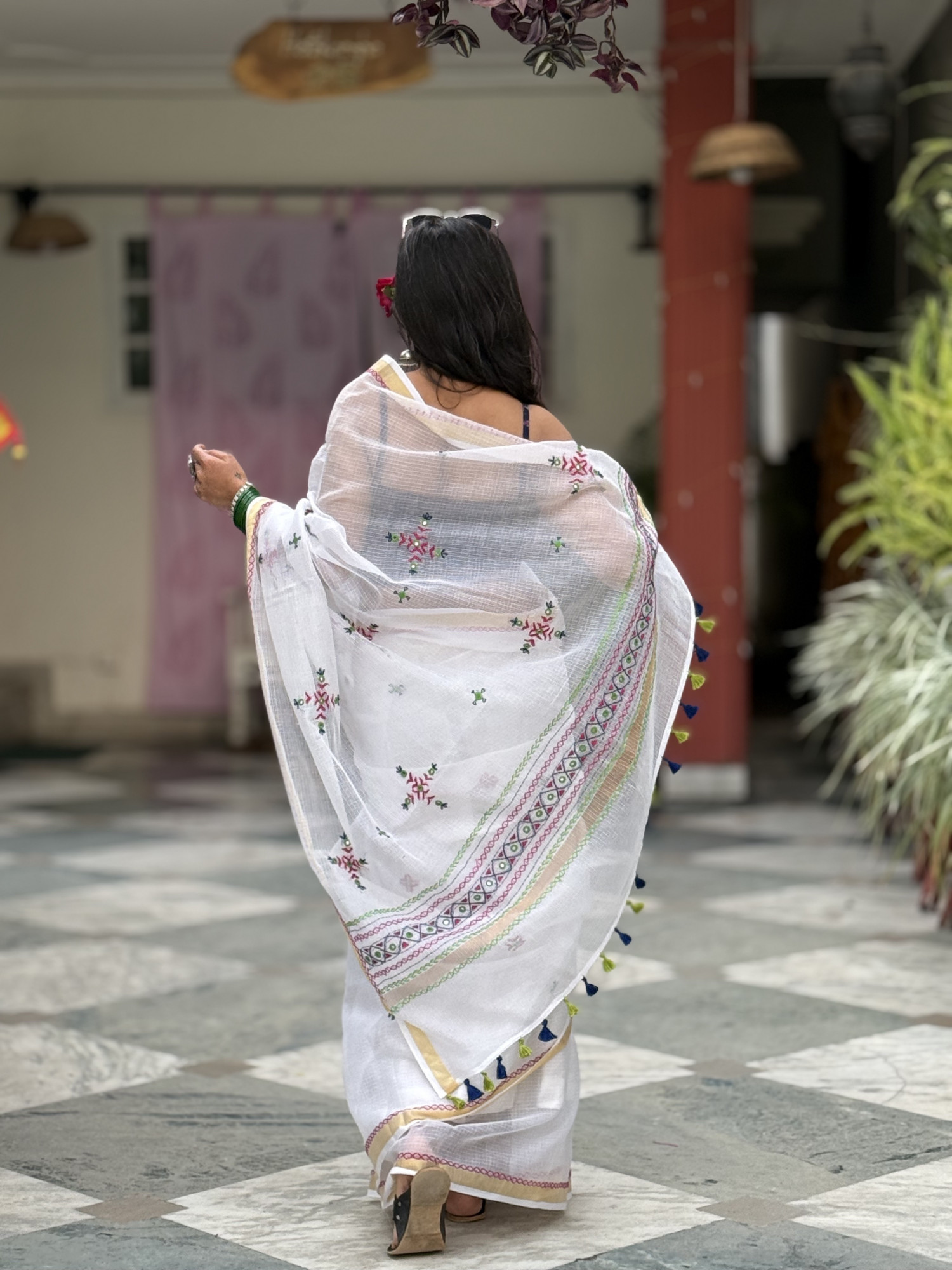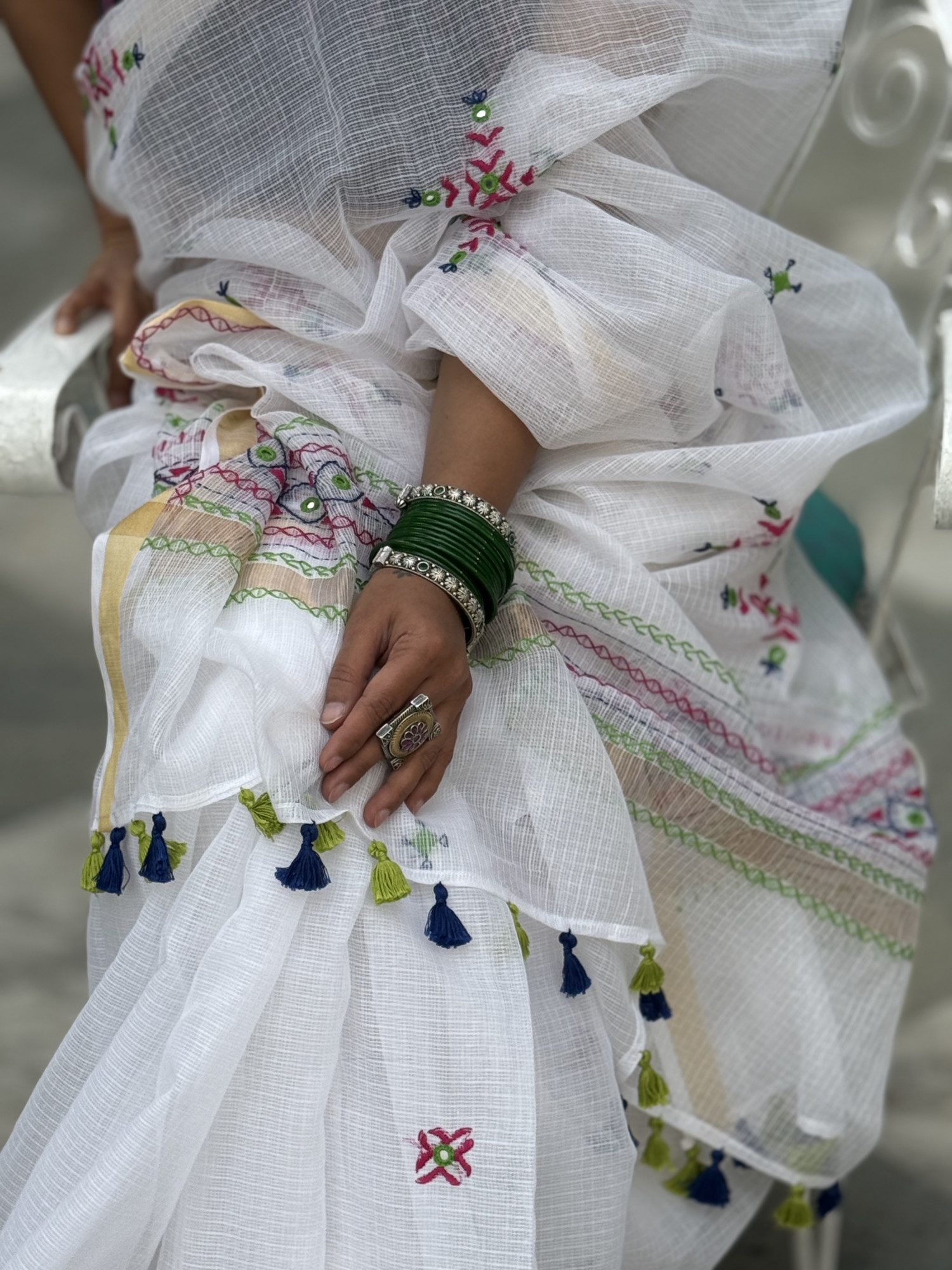 WHITE Kota cotton hand embroidered sari, with a zari woven border, accessorised with tassels.