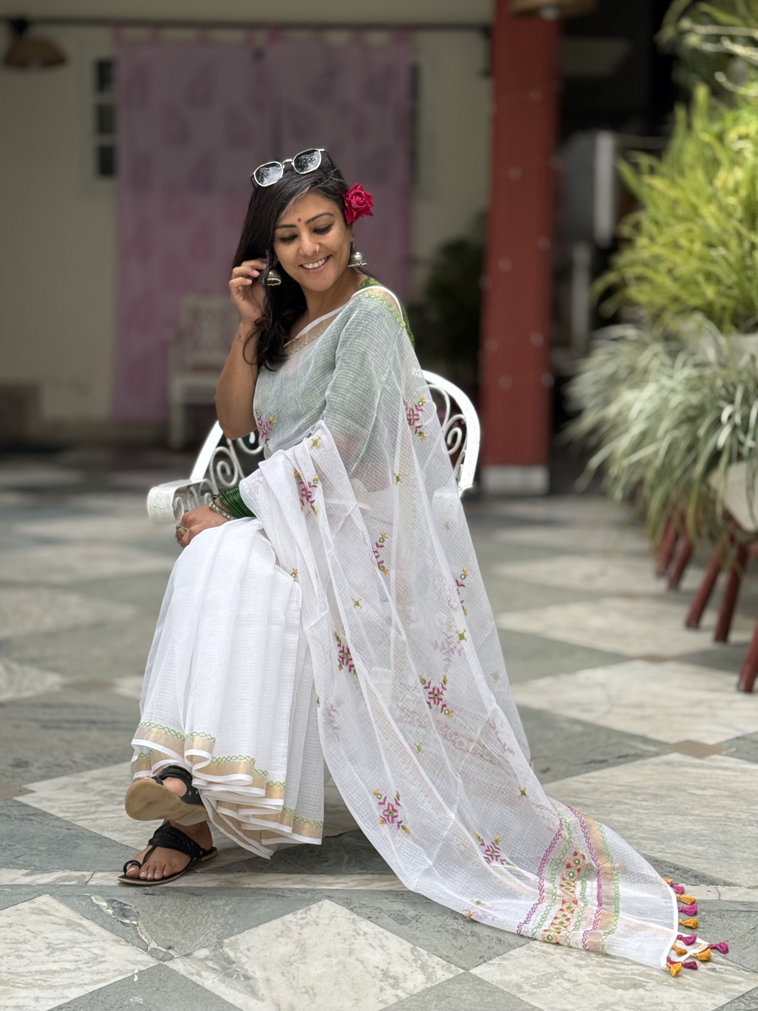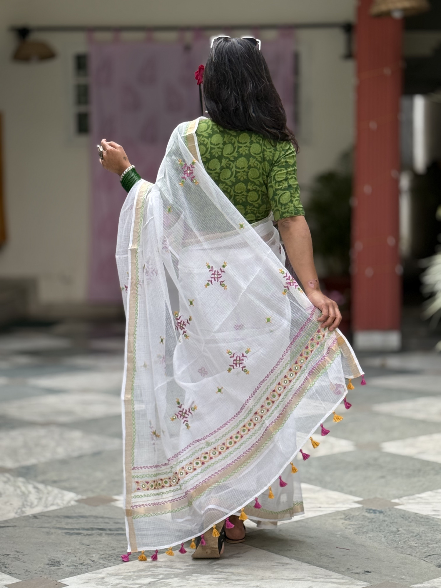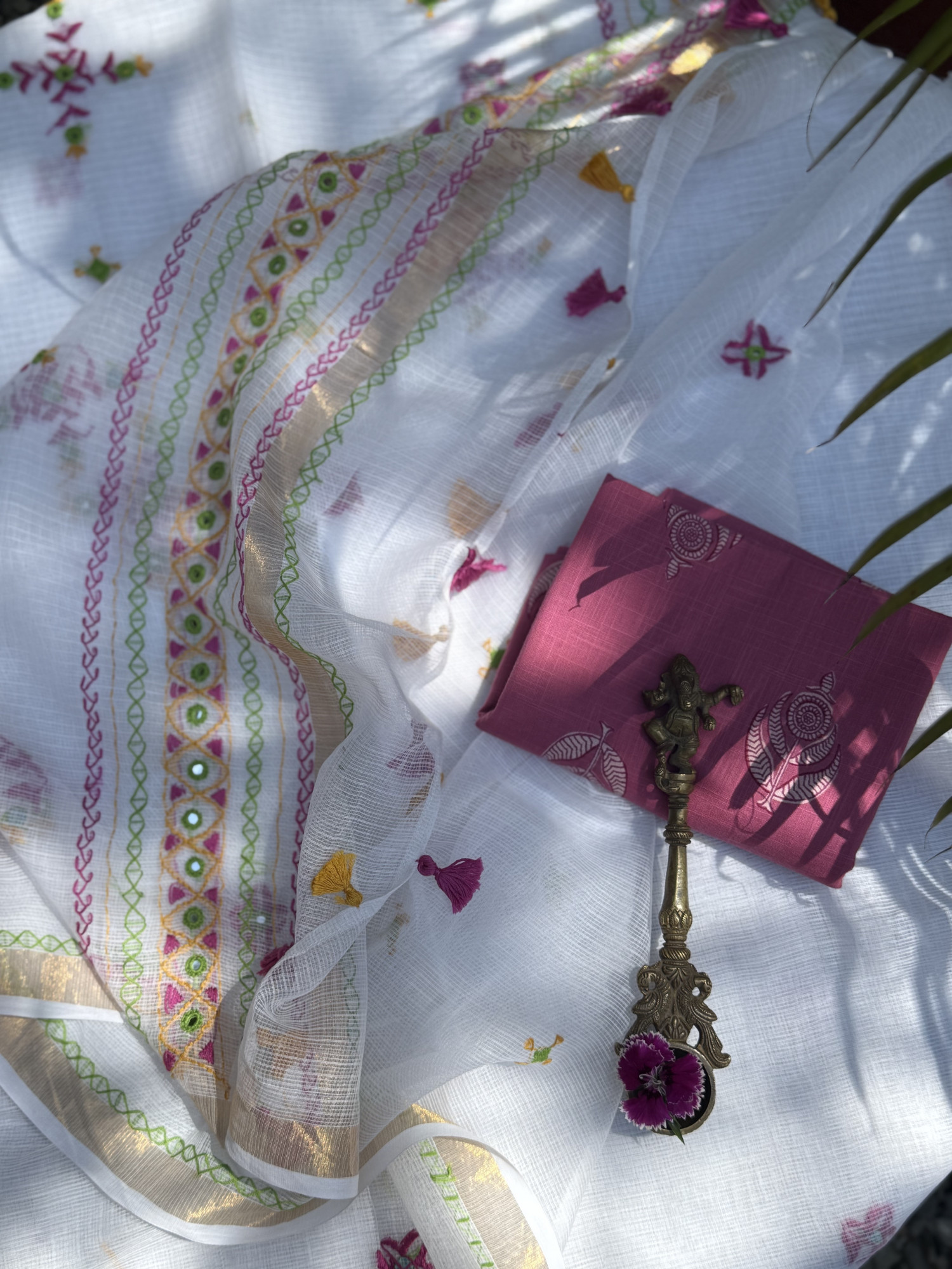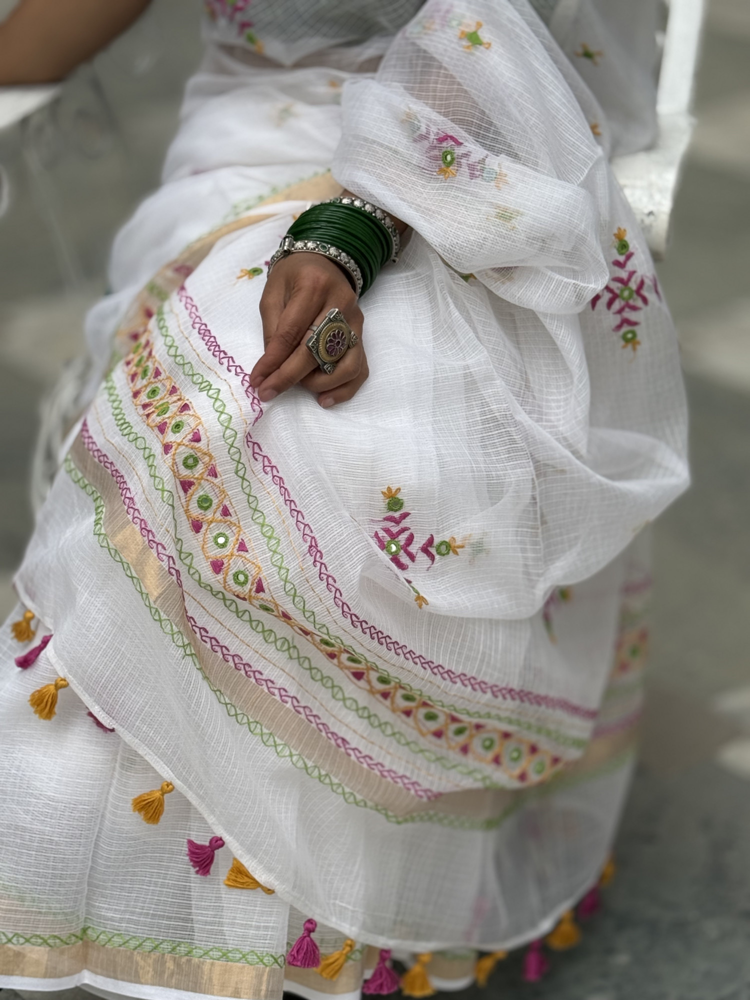 WHITE Kota cotton hand embroidered sari, with a zari woven border, accessorised with tassels.