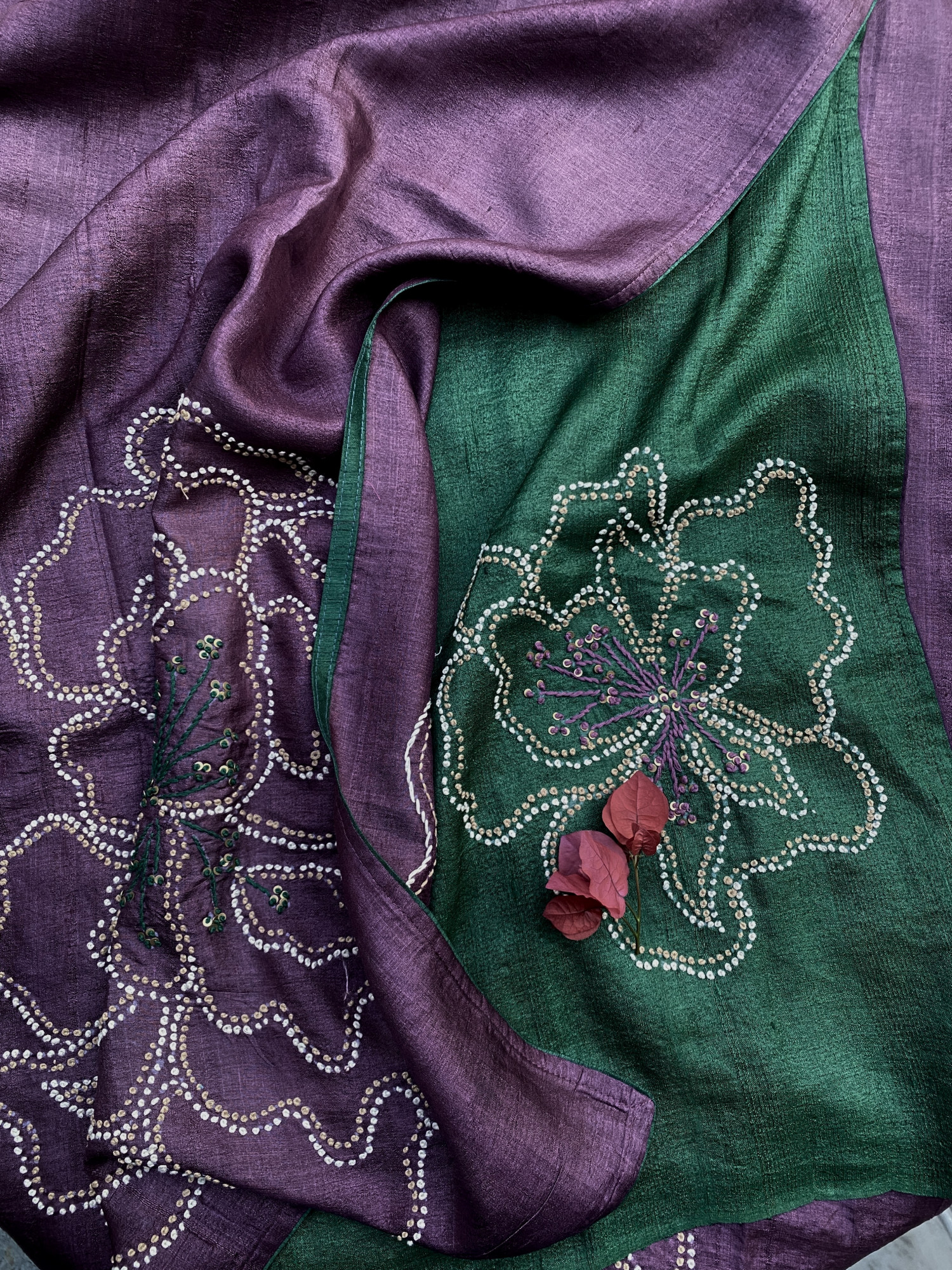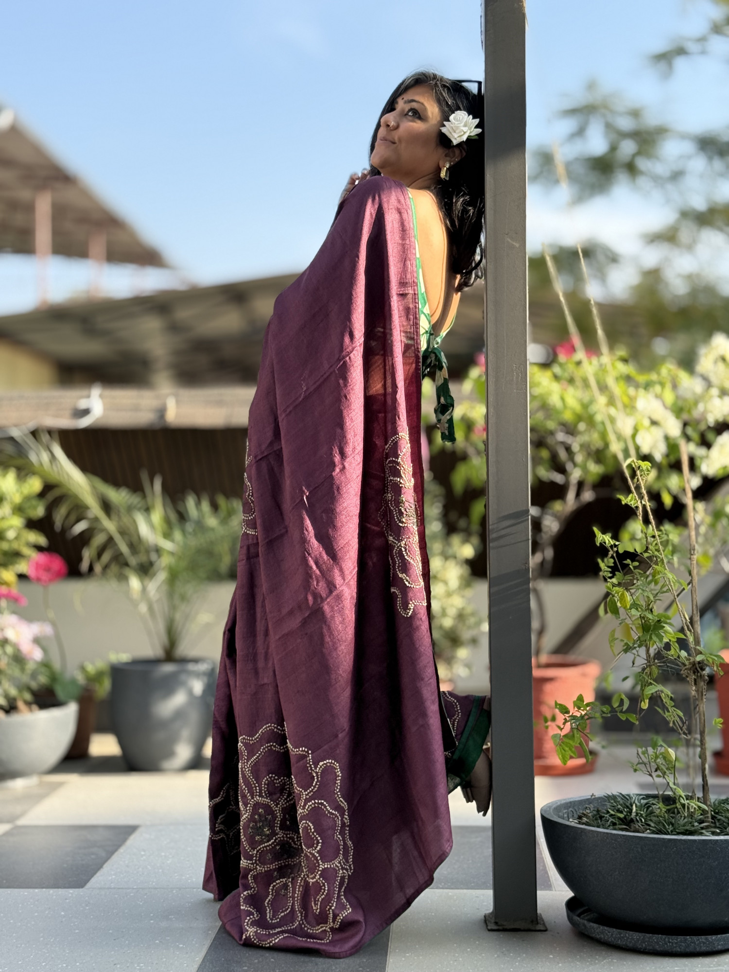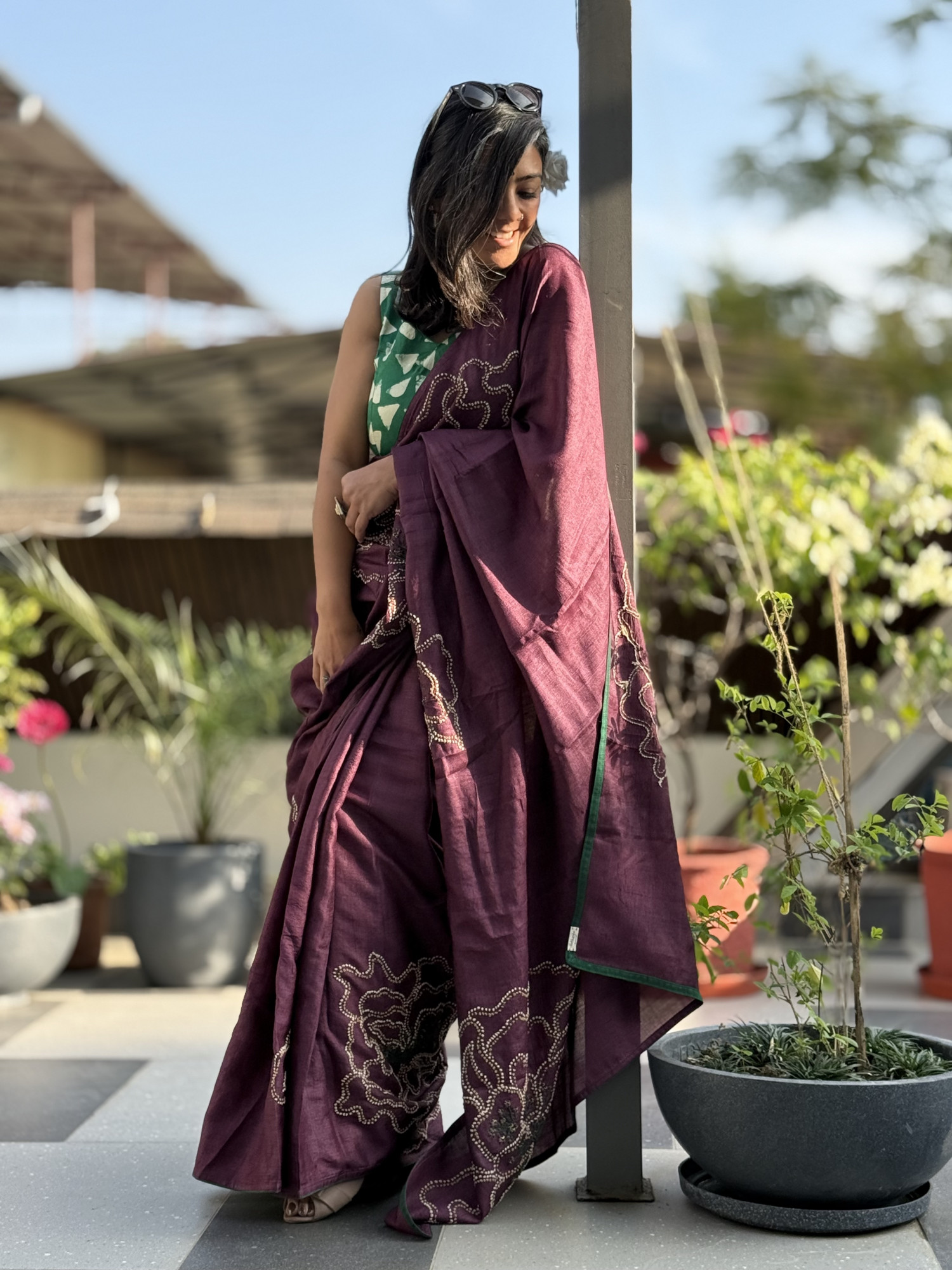 WINE NATURAL DYED TUSSAR SILK SARI WITH HAND EMBROIDERY ALL OVER , ACCESSORISED WITH TAPINGS