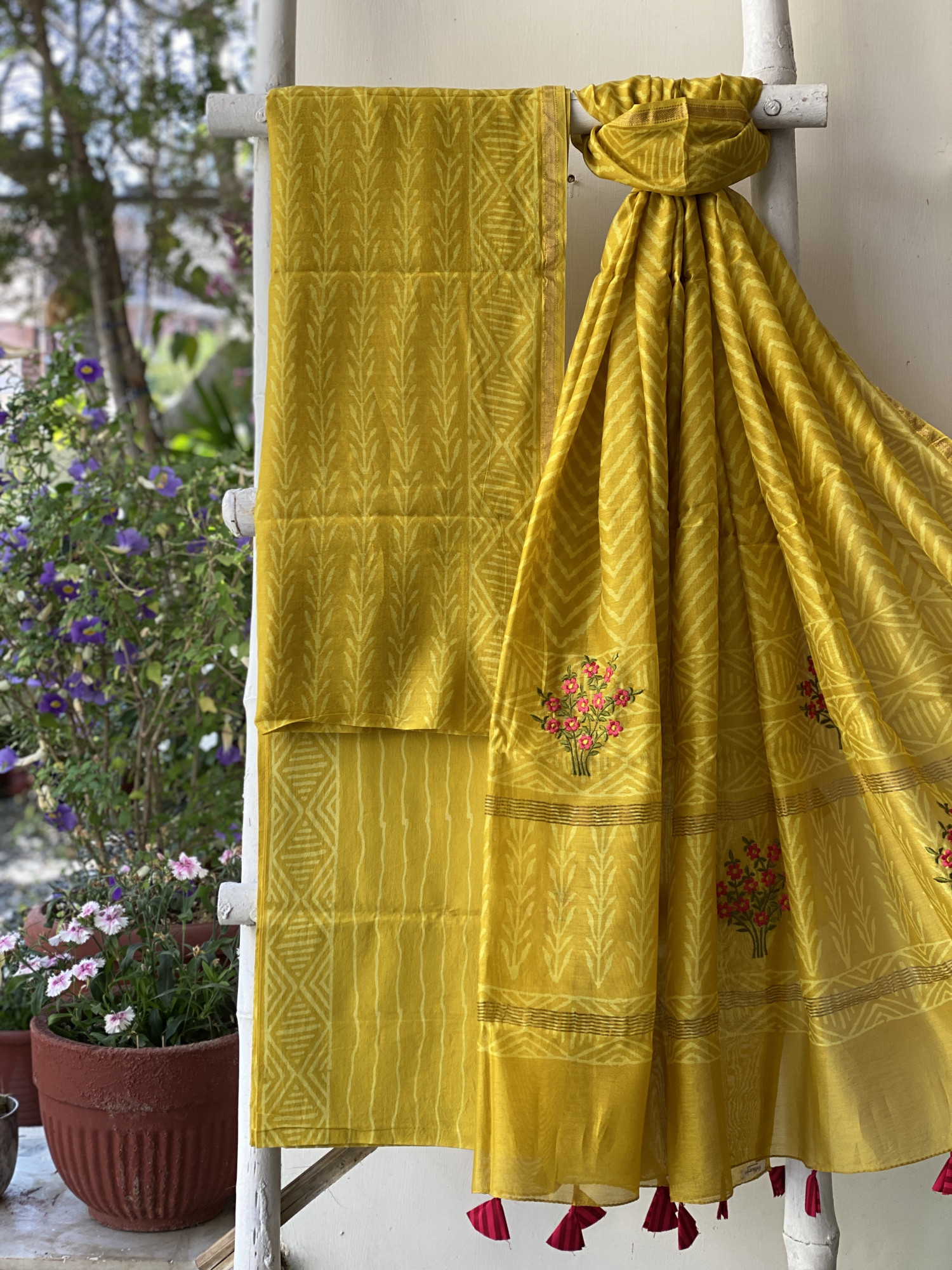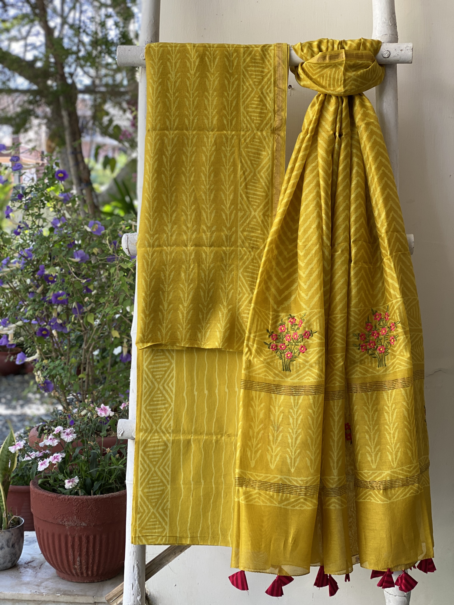 YELLOW CHANDERI cotton silk block print shirt with YELLOW BLOCK PRINT COTTON BOTTOM paired with A YELLOW CHANDERI silk and cotton BLOCK PRINT DUPATTA WITH MANUAL MACHINE EMBROIDERY, accessorised with tassles.