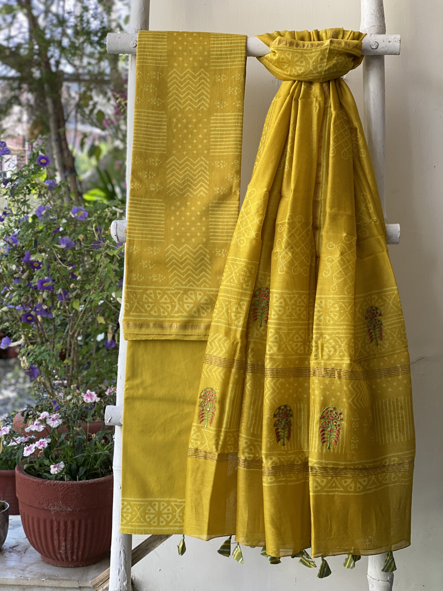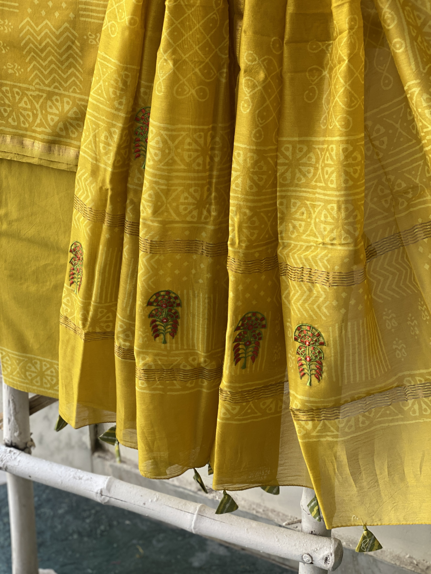 YELLOW CHANDERI COTTON BLOCK PRINT EMBROIDERED DUPATTA SET