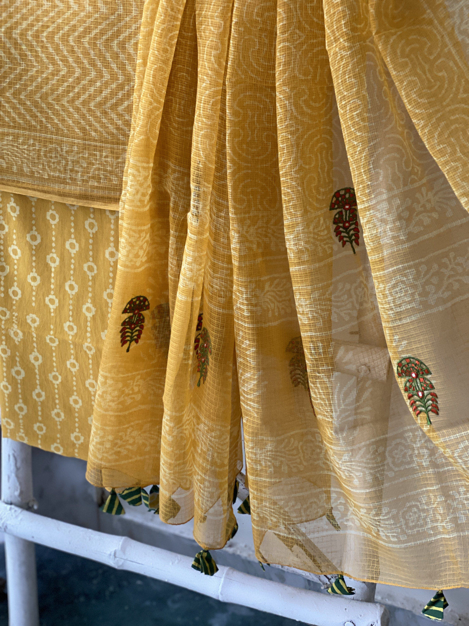 YELLOW "DABU" HAND BLOCK PRINT KOTA SHIRT AND YELLOW HAND BLOCK PRINTED COTTON BOTTOM PAIRED WITH A YELLOW KOTA HAND BLOCK PRINT DUPATTA WITH MANUAL MACHINE EMBROIDERY, ACCESSORISED WITH TASSLES.