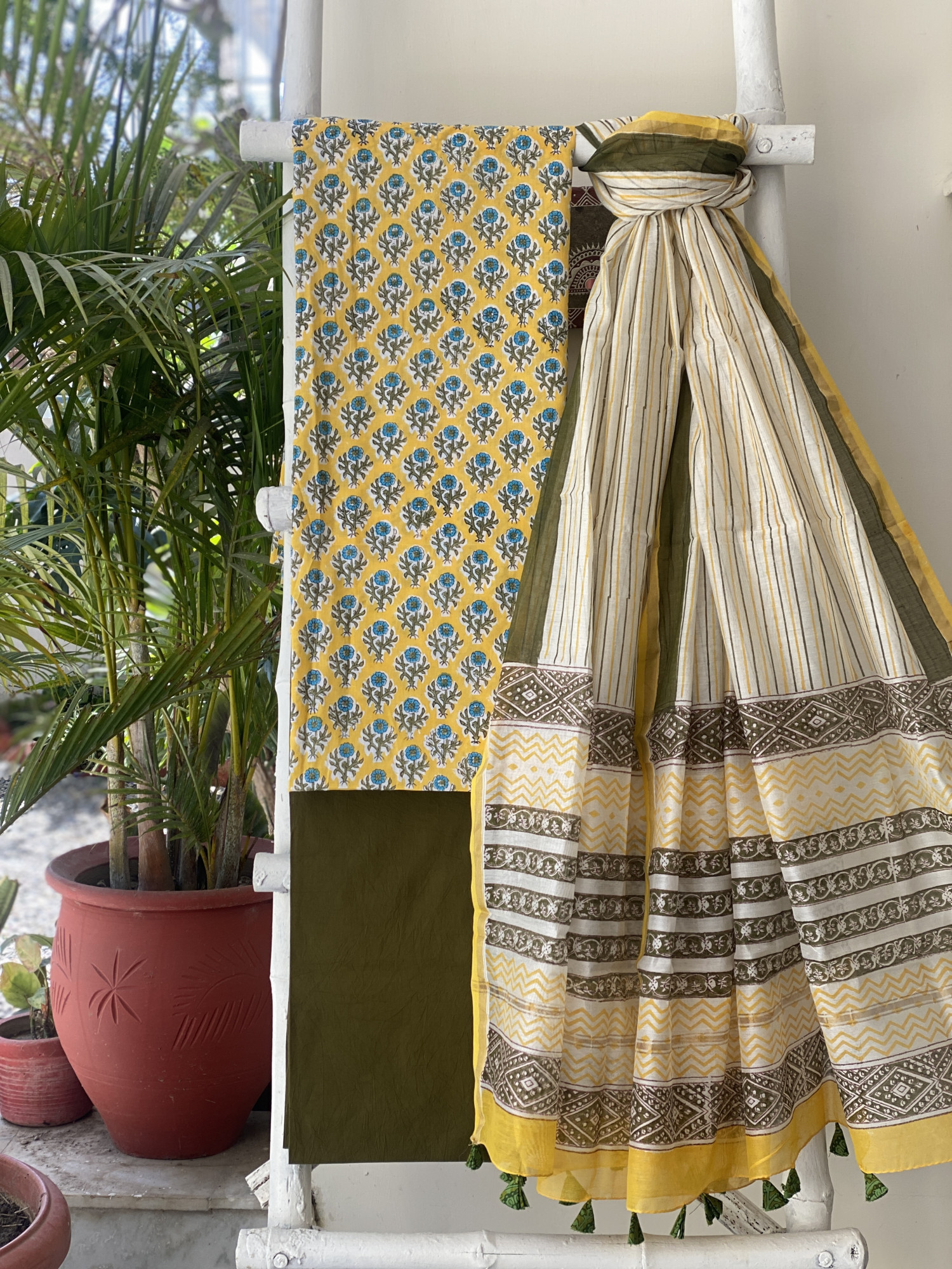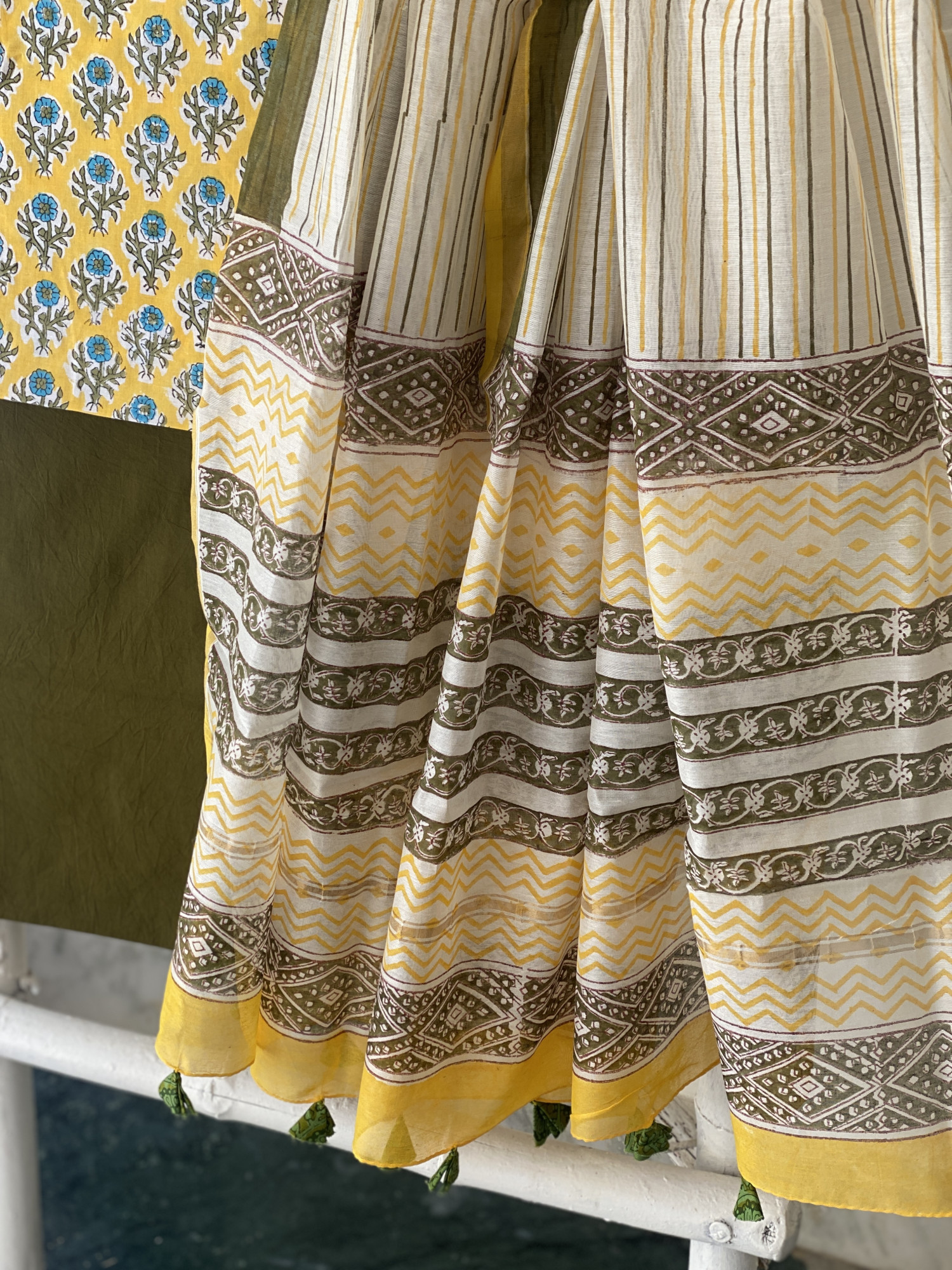 YELLOW Cotton BLOCK PRINT SHIRT AND MEHNDI GREEN PLAIN COTTON BOTTOM PAIRED WITH OFF WHITE CHANDERI BLOCK PRINT DUPATTA, ACCESSORISED WITH TASSLES.