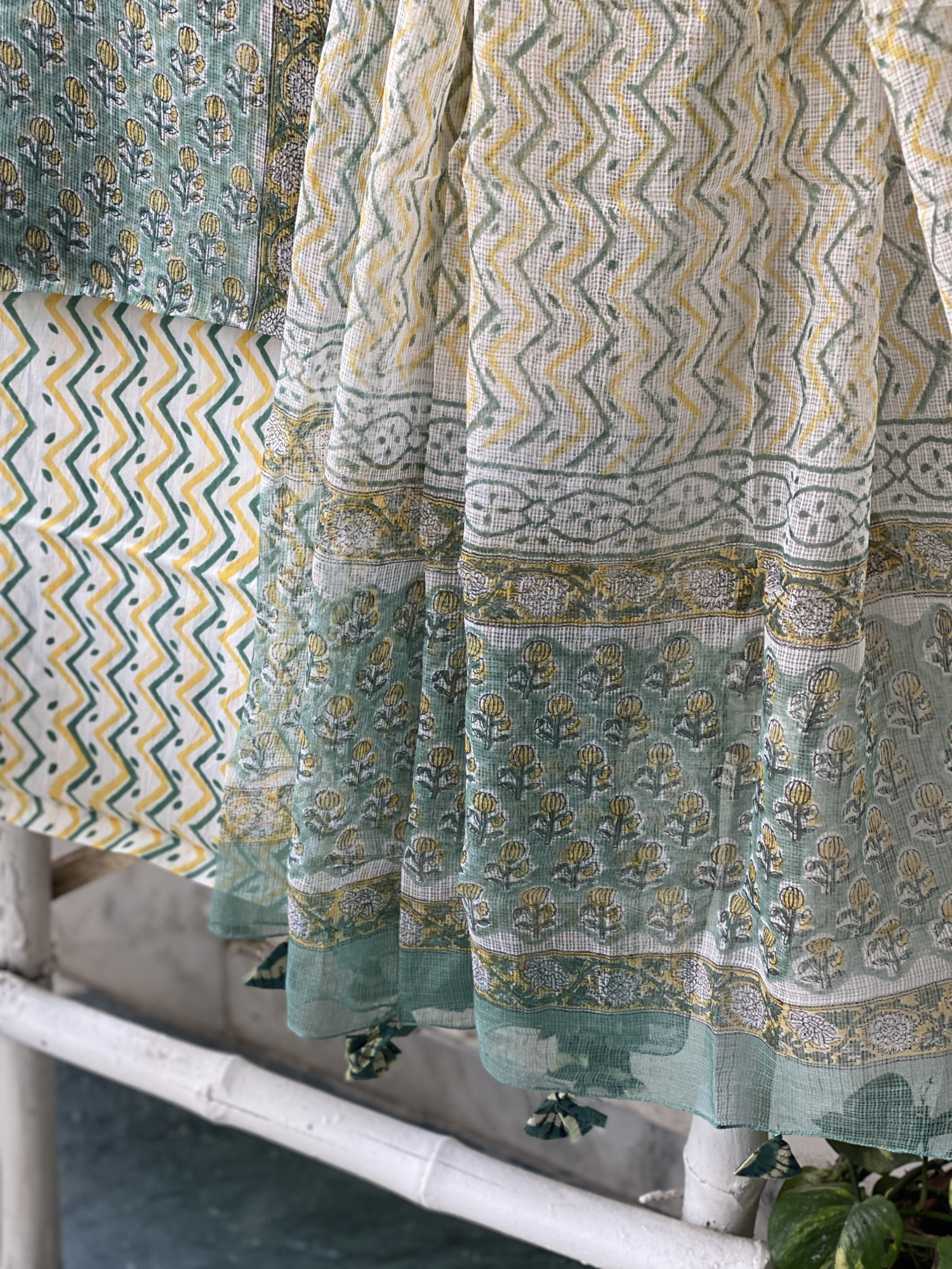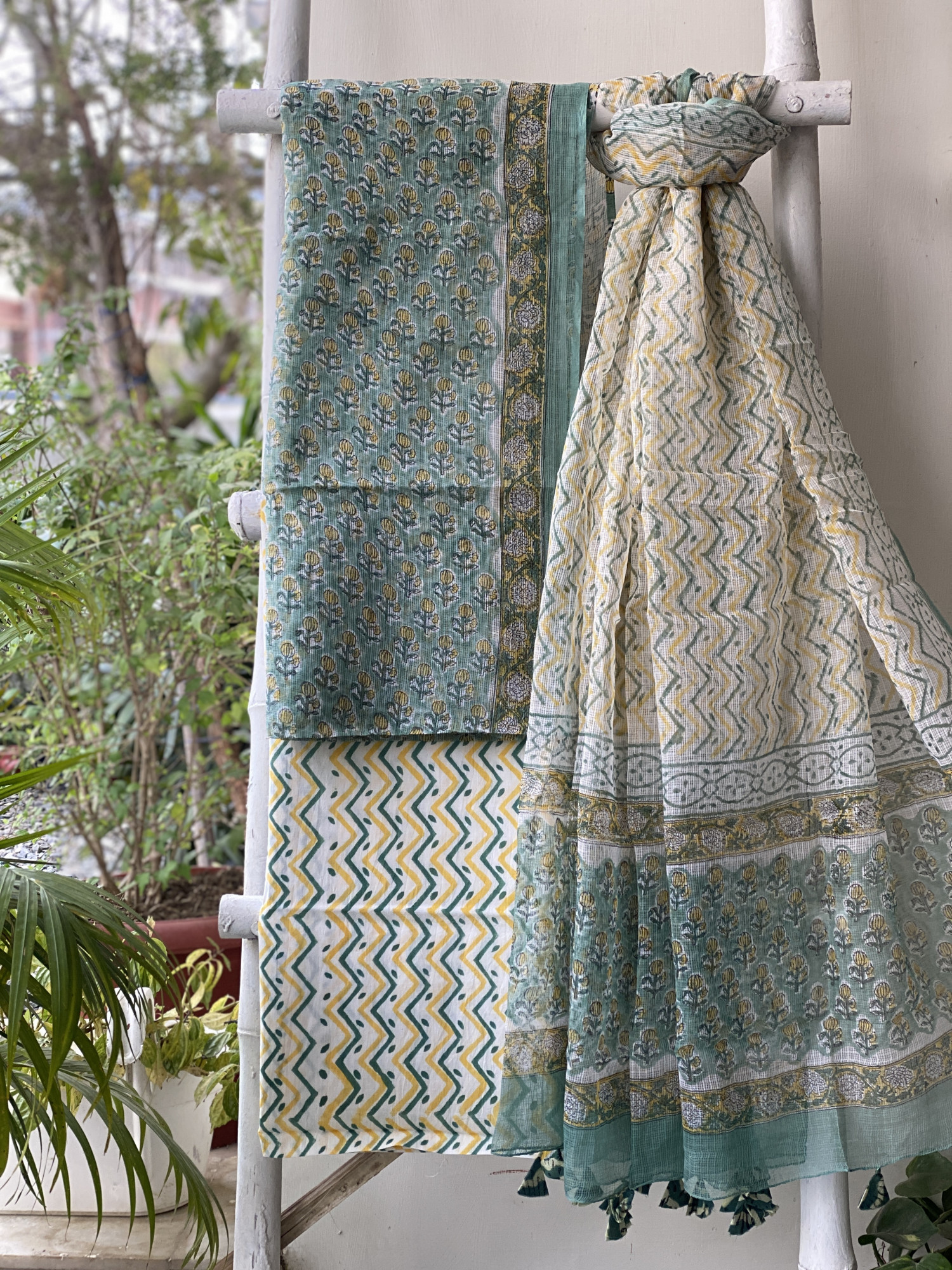 SEA GREEN HAND BLOCK PRINT KOTA SHIRT (COMES WITH A MATCHING COTTON LINING PIECE) AND AN OFF WHITE COTTON BLOCK PRINT BOTTOM PAIRED WITH AN OFF WHITE KOTA BLOCK PRINT DUPATTA, ACCESSORISED WITH TASSLES.